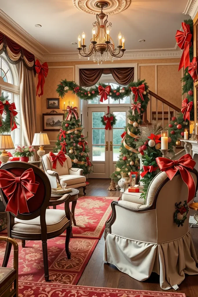 I prefer twisting ribbons around candelabras, hanging them over mantels, or tied up into great bows over pieces of furniture and staircases. Ribbons of satin or velvet, either red, gold or green, are especially beautiful. The bows may also be put on throw pillows, around glass jars with ornaments and even as curtain tiebacks.