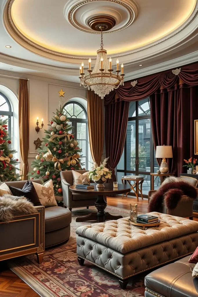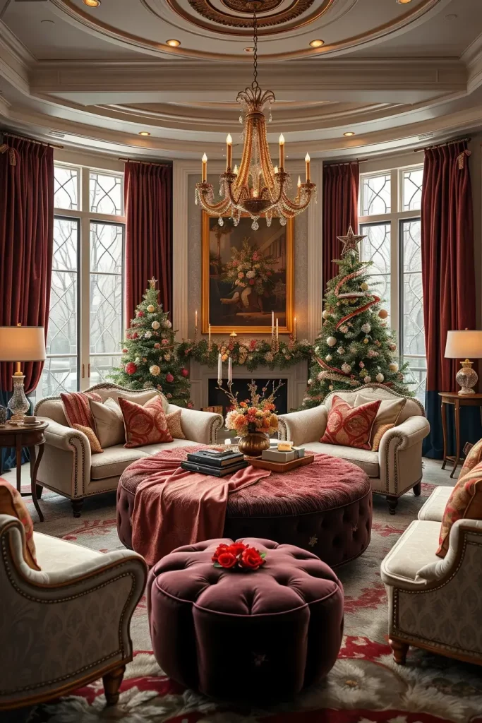 I tend to use velvet cushions, silk table runners and fake fur throws that are spread around the sofas or chairs. A sense of drama is produced with heavy curtain, deep jewel overtones or metallic finish. Ottomans and accent chairs in expensive fabrics are also upholstered, contributing to the festive environment.