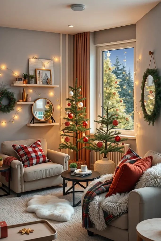 The size is the first consideration when I am designing Christmas room decor in small spaces. Large trees or furniture can be overwhelming and small solutions can be used that fit into the room well such as pencil trees that are very thin or tabletop decorations. Brightness on the walls is enhanced by light colors and ornaments that reflect light, thus making the place look bigger. It is also a good idea to add mirrors behind a Christmas tree to increase the brightness.