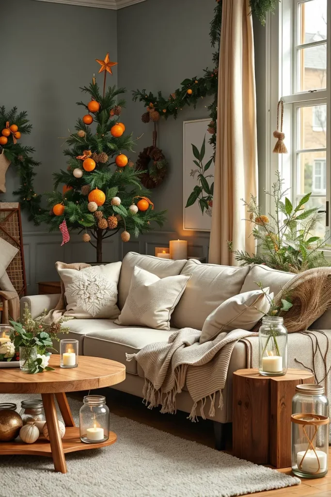 As far as furniture and accents are concerned, I would opt to reuse existing furniture back at home. Neutral sofa also can be decorated with the eco-friendly throw covers, and glass jars are perfect to contain LED string lights. Dry oranges, pinecones or cinnamon sticks can be used in handmade garlands and they add the fragrance and style as well. These touches render the space joyful without being irresponsible of the environment.