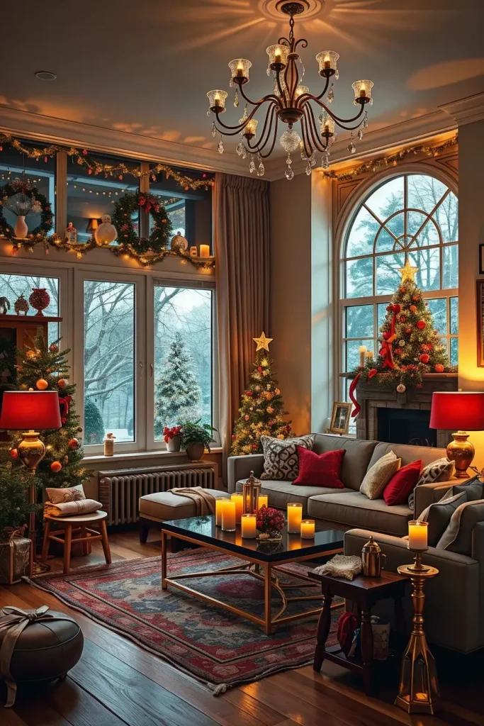 The addition I would make here is a reading corner close to the adorned window possibly with a warm blanket and a holiday pillow. It renders the room not only festive but also functional.