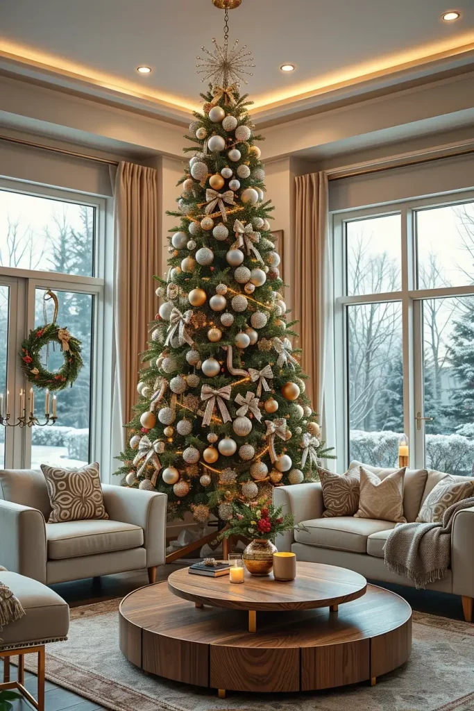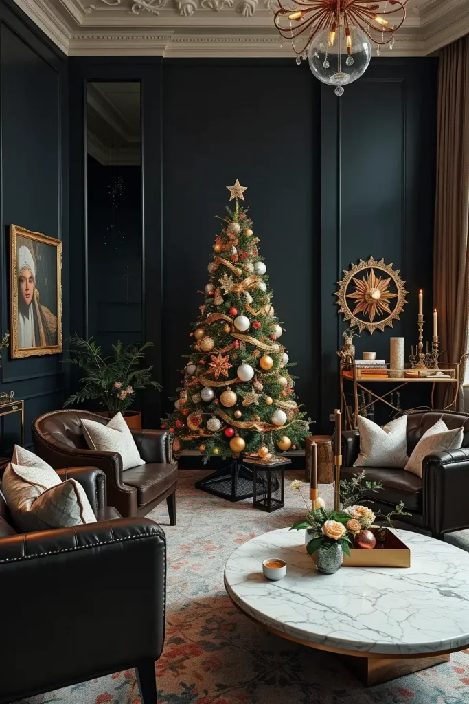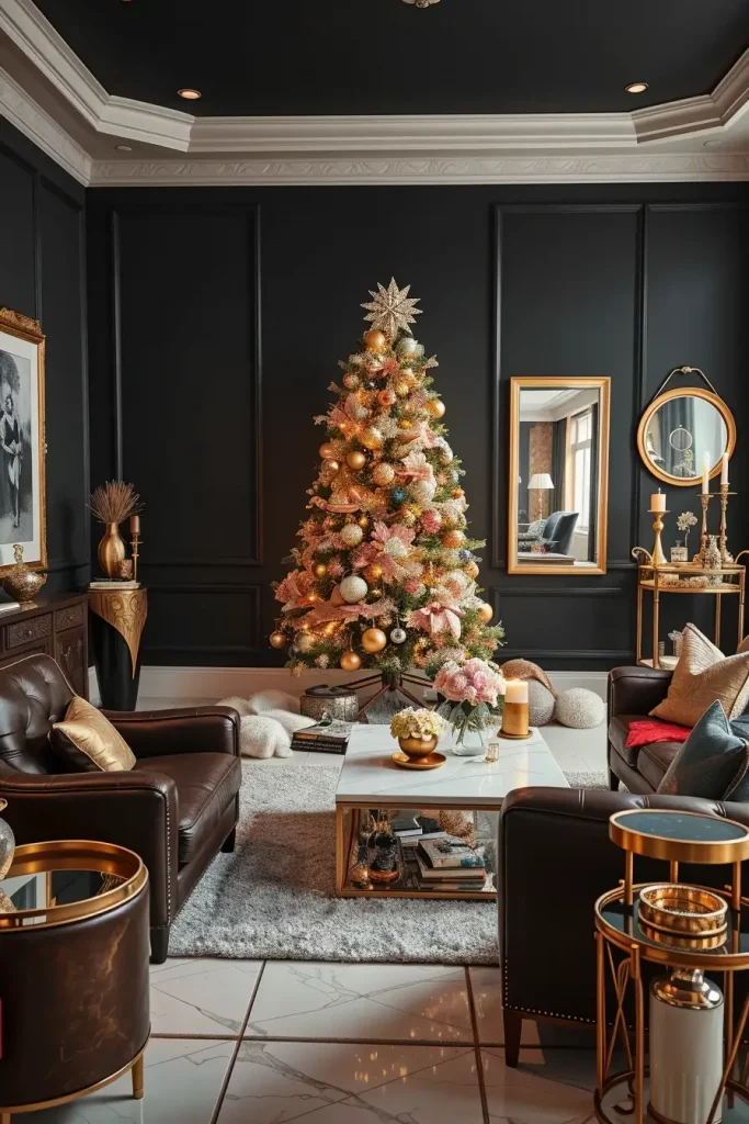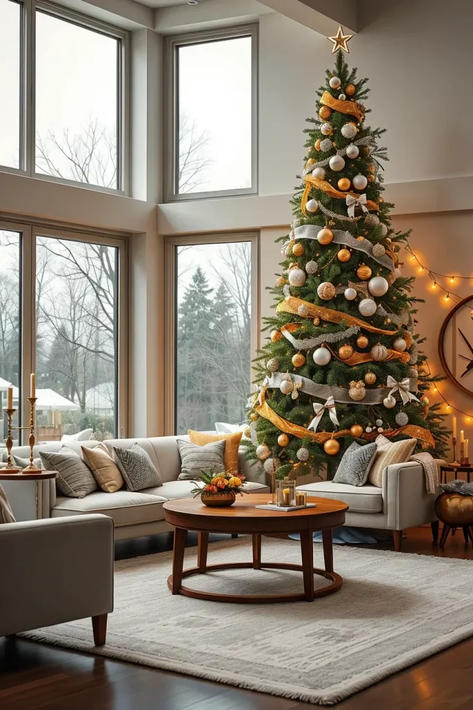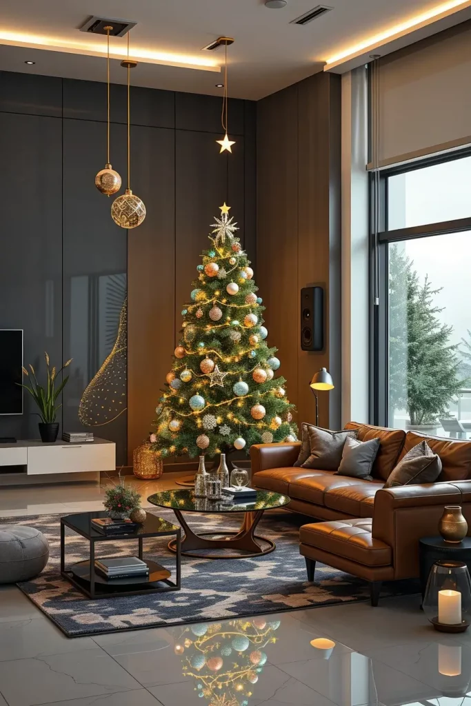 Metal accents are the order of the day in holiday decor. As Christmas tree decorations ideas 2025, I would recommend using ornaments of gold, silver, and rose-gold in order to give it a glamorous look and also make it balanced. A metallic-themed tree stands out as one of the most impressive features in a living room with dark walls, smooth furniture, and mirrors.