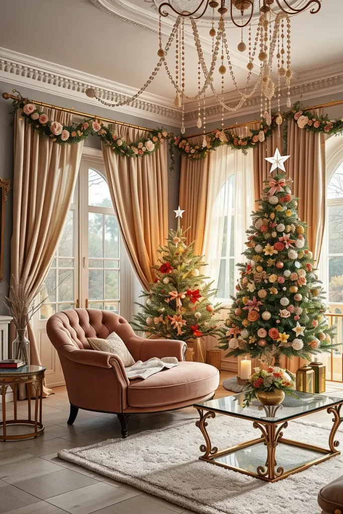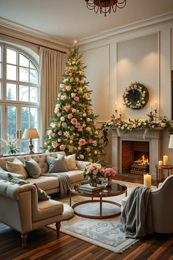 In this type of arrangement, I tend to suggest combining the tree with a cream or gray tufted sofa and warm-textured soft throws. The scene is finished with a glass coffee table with brass decoration and the floral decorations are left to be the focus. To give it a better appearance, I tend to place floral garlands around the mantel or the door to the room, and make the entire room have a unified atmosphere.
