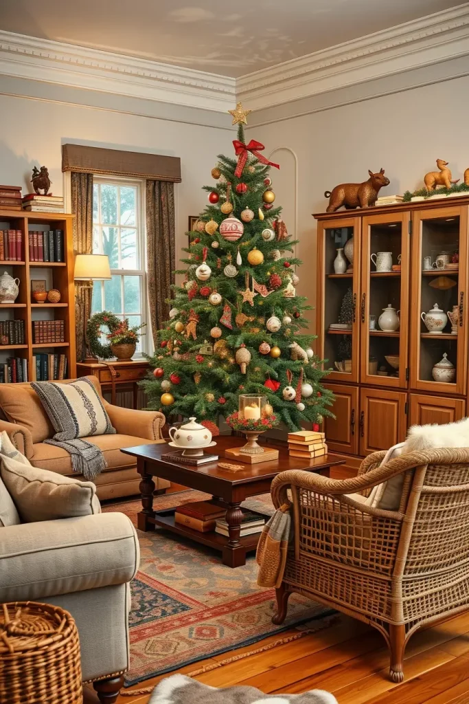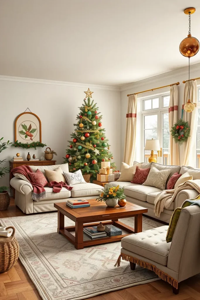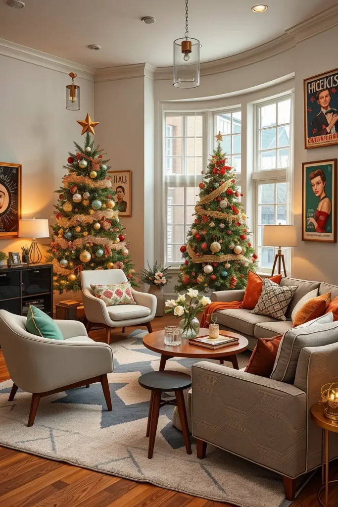 This tree is matched with some mid-century modern furniture such as low-wood consoles, curvy armchairs, and geometrical carpets to create this harmony. The vintage ornaments will not make the room look dated because a neutral sofa with bold pillows can be used to tie the room together.