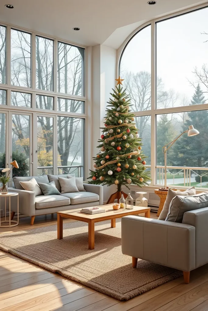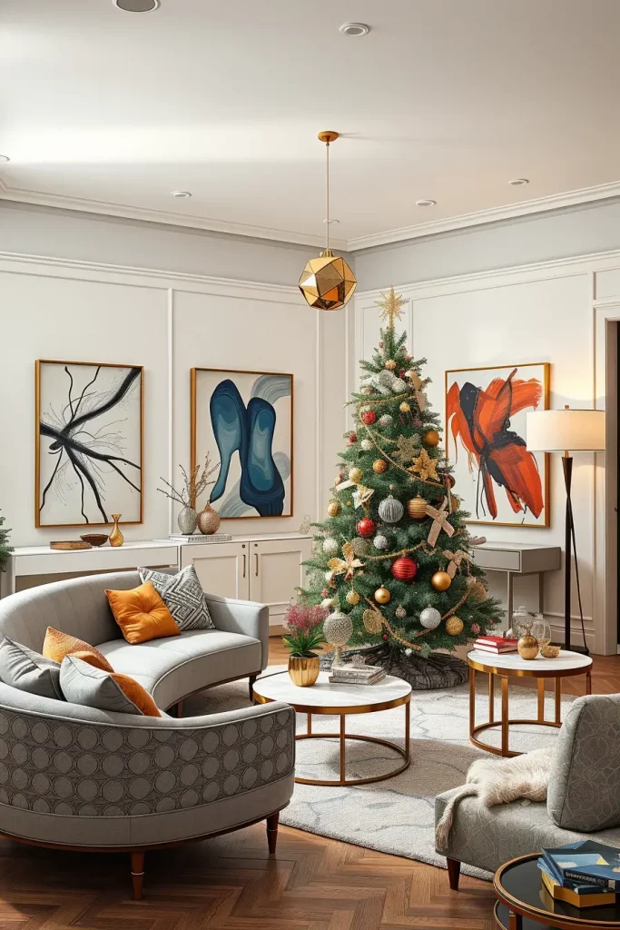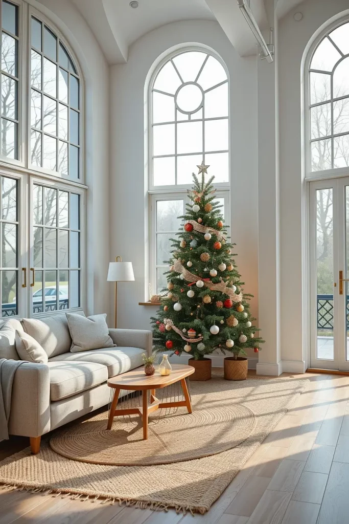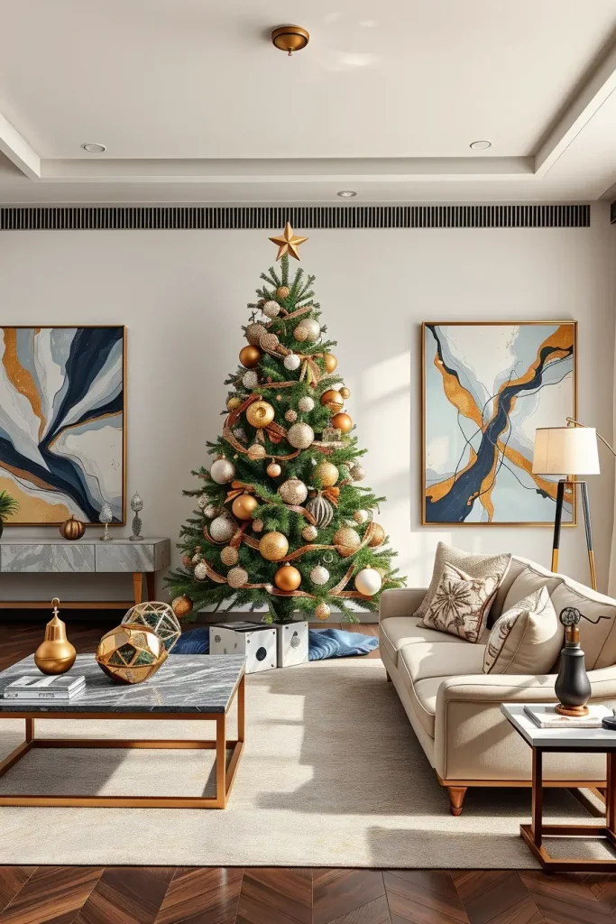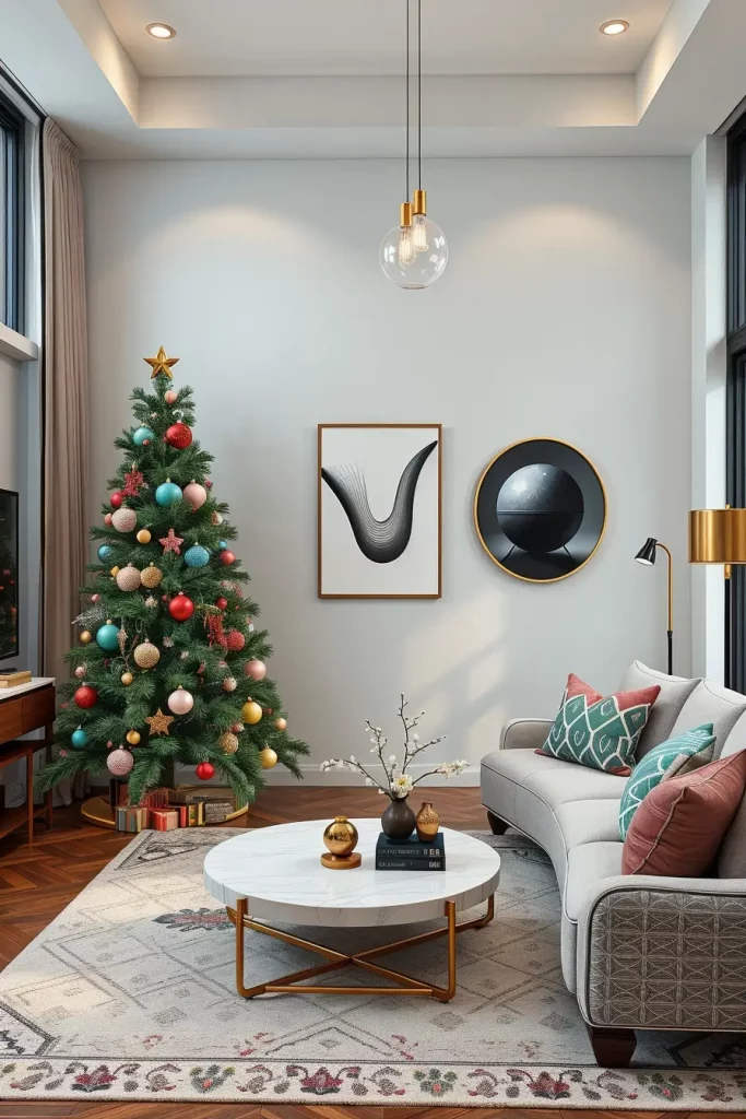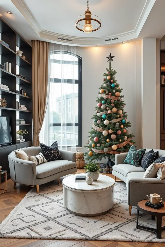 I suggest incorporation of sculptural pieces of furniture like a curved couch or a marble coffee table to pass the creativity of decorations of the tree. Even such minor ornaments as patterned rugs or geometric cushions can hold it together. This causes the Christmas tree to seem a part of a larger design statement as opposed to a seasonal addition.