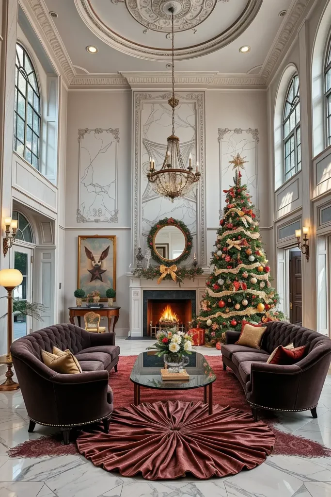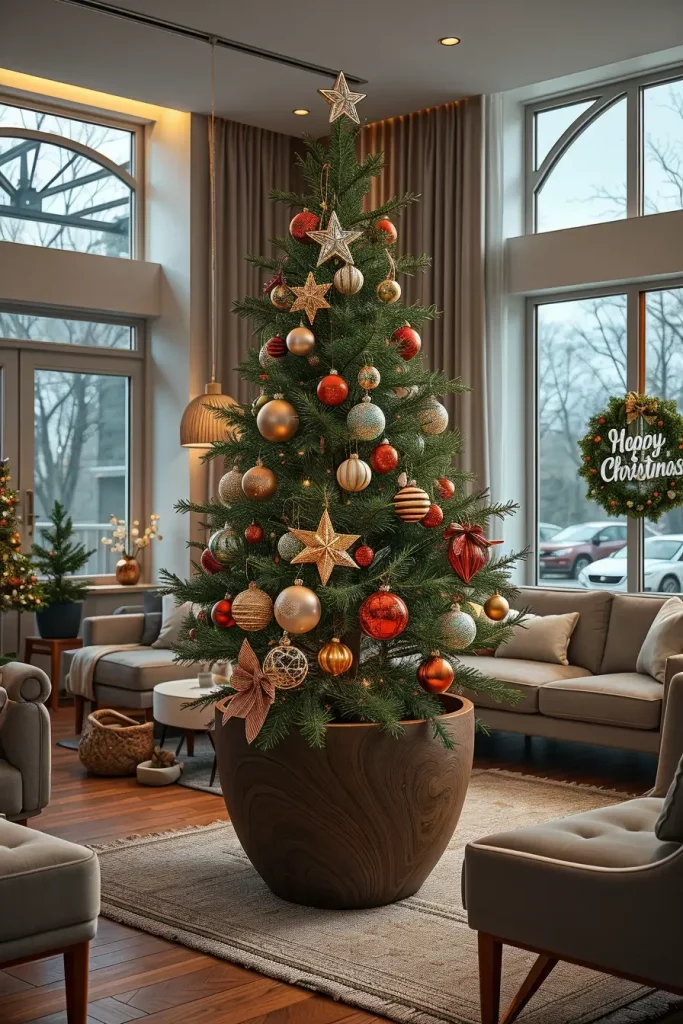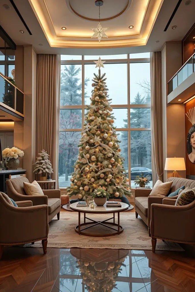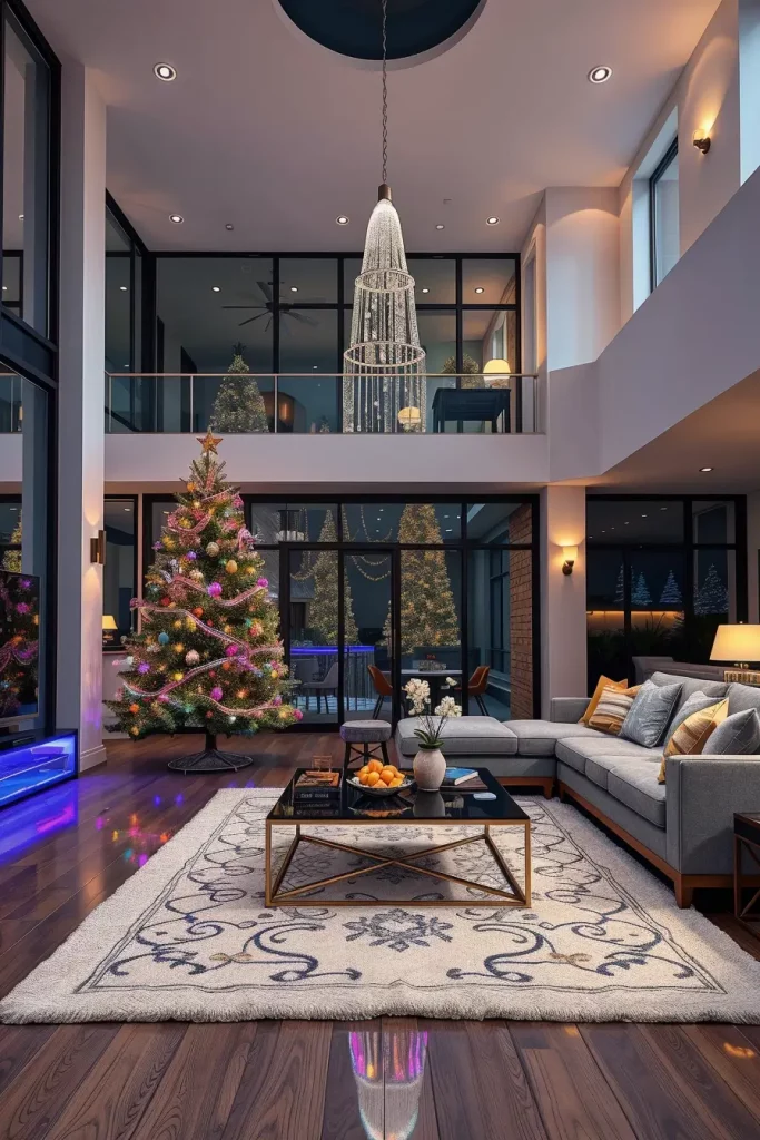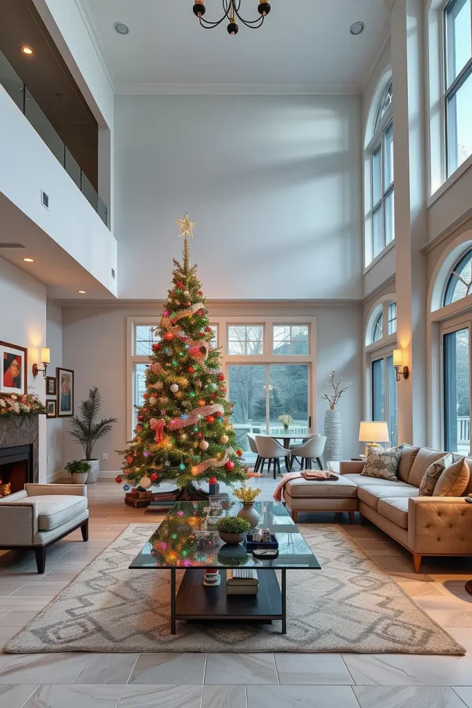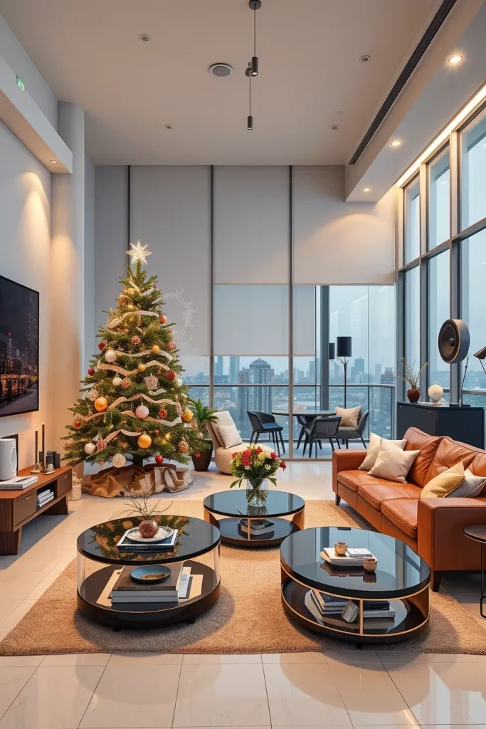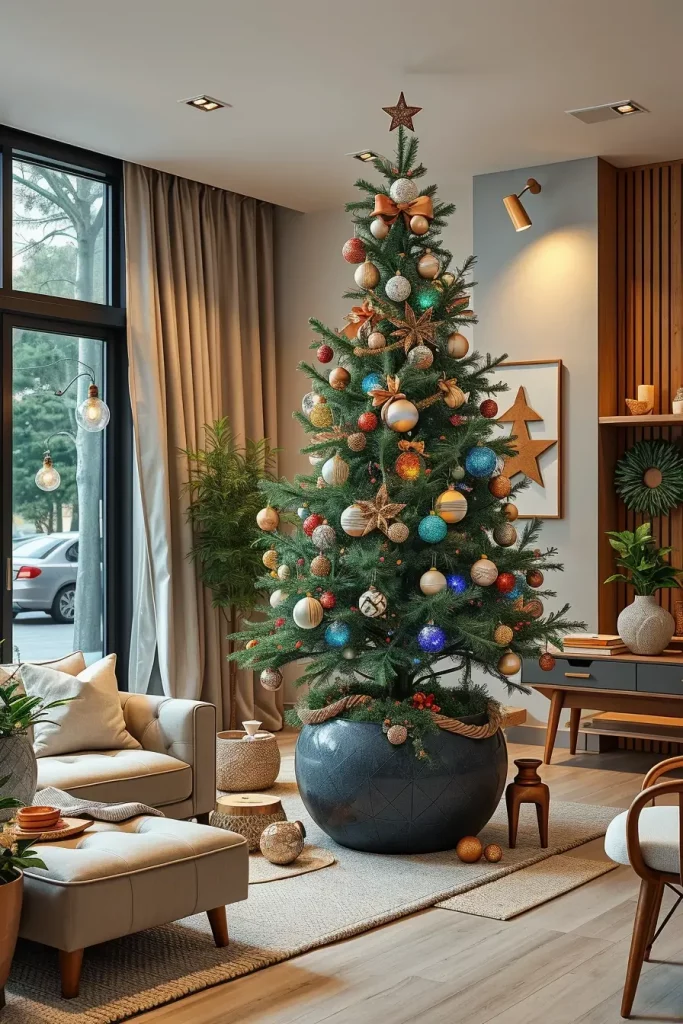 I suggest incorporation of sculptural pieces of furniture like a curved couch or a marble coffee table to pass the creativity of decorations of the tree. Even such minor ornaments as patterned rugs or geometric cushions can hold it together. This causes the Christmas tree to seem a part of a larger design statement as opposed to a seasonal addition.