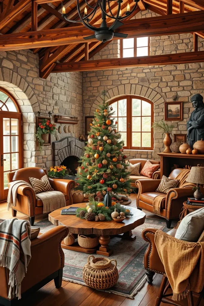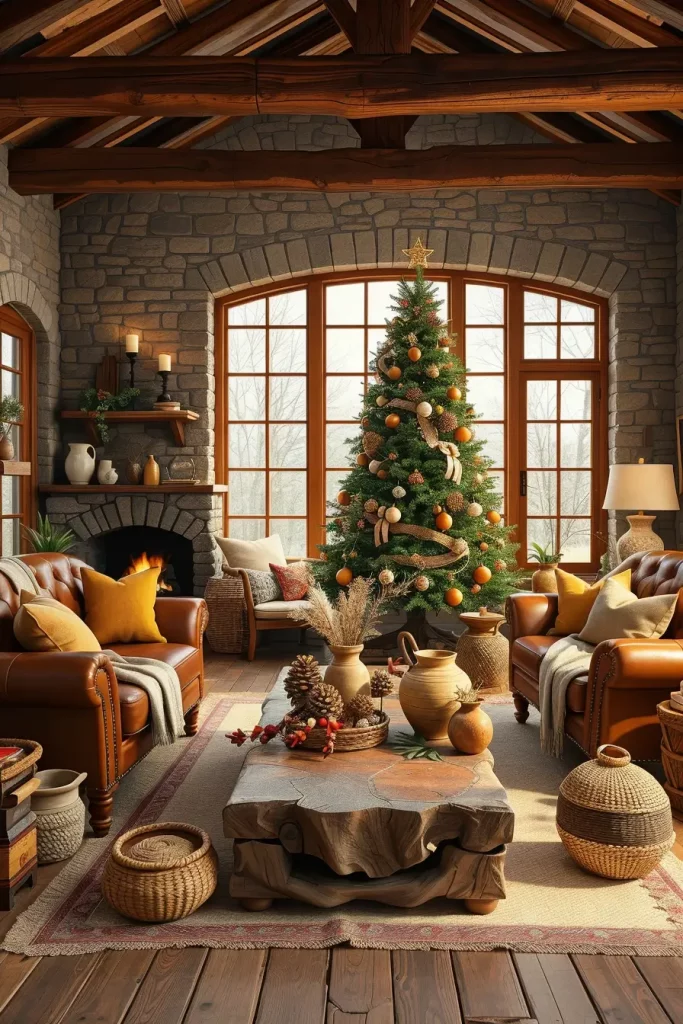 It is more sustainable than ever in 2025, and I enjoy incorporating environmentally-friendly concepts into the design of holiday decorations. When it comes to this style, I choose to use natural decorations in the form of wood, dried orange slices, cinnamon sticks and recycled paper. There is a tree with a jute tree skirt, and used wood furniture to make the atmosphere natural and cozy.