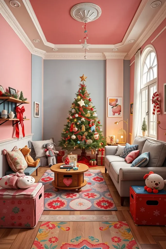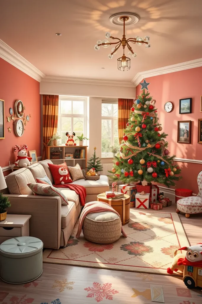 Furniture may also be significant in this regard. The room is practical and is playful with a soft sectional sofa, a patterned cheerful rug, and storage benches to store toys. The details such as themed cushions or shelves with story books close to the tree even make the experience last longer.