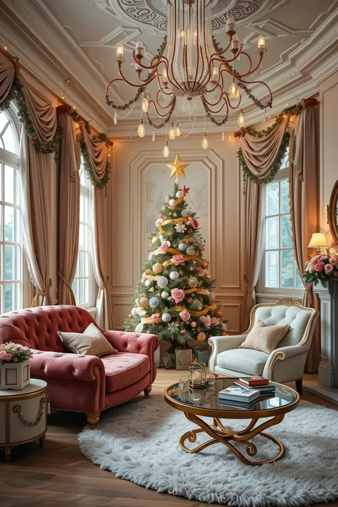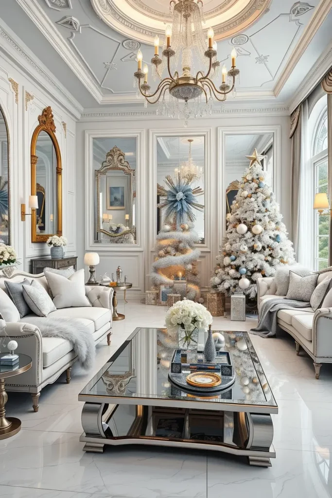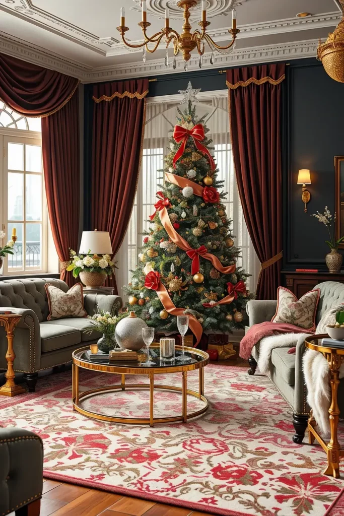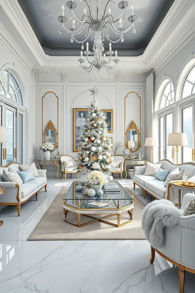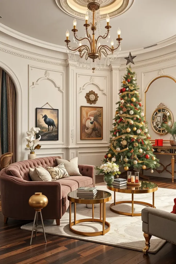 In the case of furniture, I would recommend tufted velvet couches, a metallic and glass coffee table, and lighting pieces such as chandeliers. Every composition must add to the glittering impression and not distract the attention on the sparkling tree.