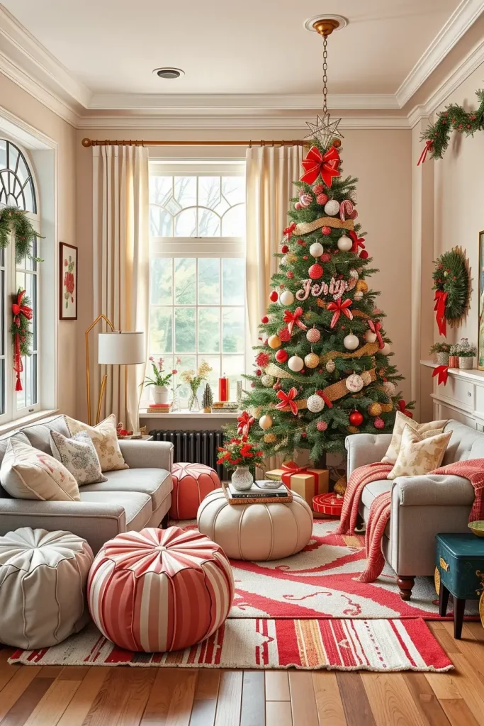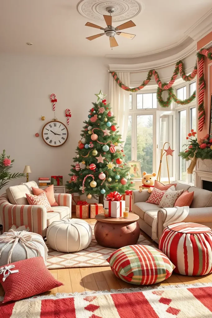 I prefer to decorate the tree with large lollipop gifts, candy sticks and garlands of gumdrops to make the tree look like it were part of a Christmas fairytale. The inclusion of striped red-and-white throws to the sofa and pastel-colored poufs scattered throughout the room finishes the whole theme. The trick is to incorporate the sweet motif with the comfortable and informal furniture to hold on to a light mood.