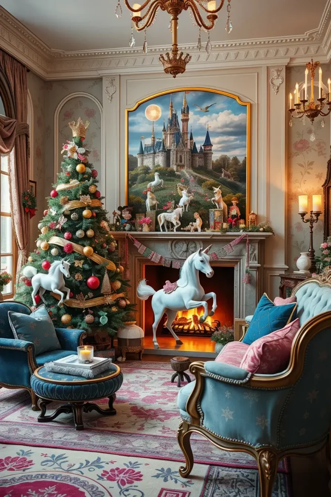 I would suggest delicate ornaments in soft pink, silver and white colors. A velvet tufted sofa or chaise lounge, glass coffee tables, and sheer curtains create an unbelievable feel that is the direct replica of a storybook.
