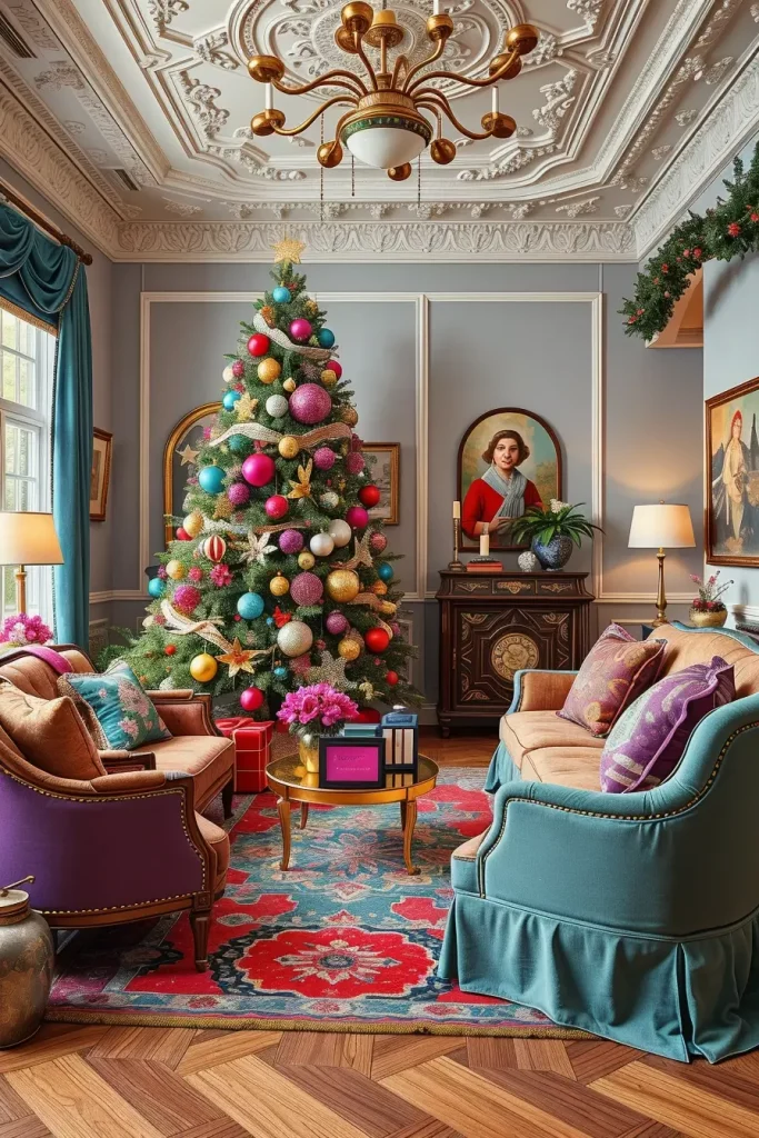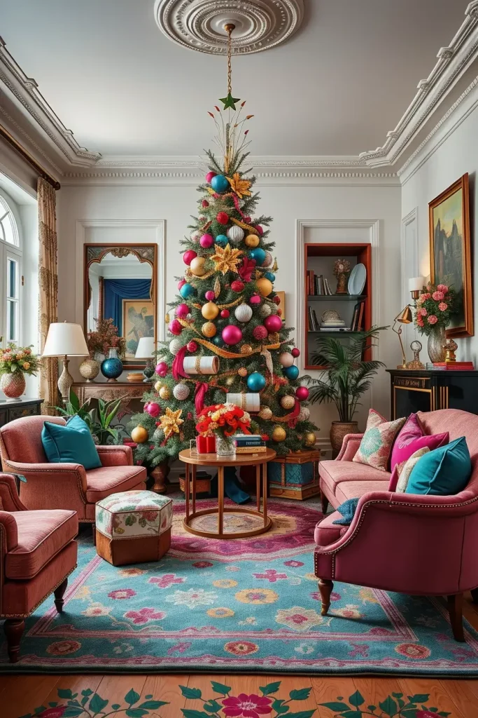 I usually apply oversized ornaments in contrasting color combinations and as a balance to the loudness, I put them together with metallic garlands. Placing colorful cushions and statement armchairs around the tree makes the effect more prominent and does not leave the tree alone. An eclectic rug beneath the coffee table can support the space and unite the palette.