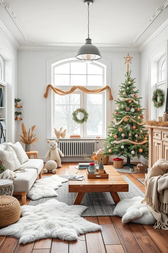 I will typically do this with a real or a realistic artificial tree and adorn it with ornaments of a neutral tone in order to create this appearance; that is, wooden stars, white baubles, and garlands of straw. The throws on the sofa are made of soft wool, a plain wooden coffee table, and sheepskin carpets are present, yet they do not betray the minimalist style.