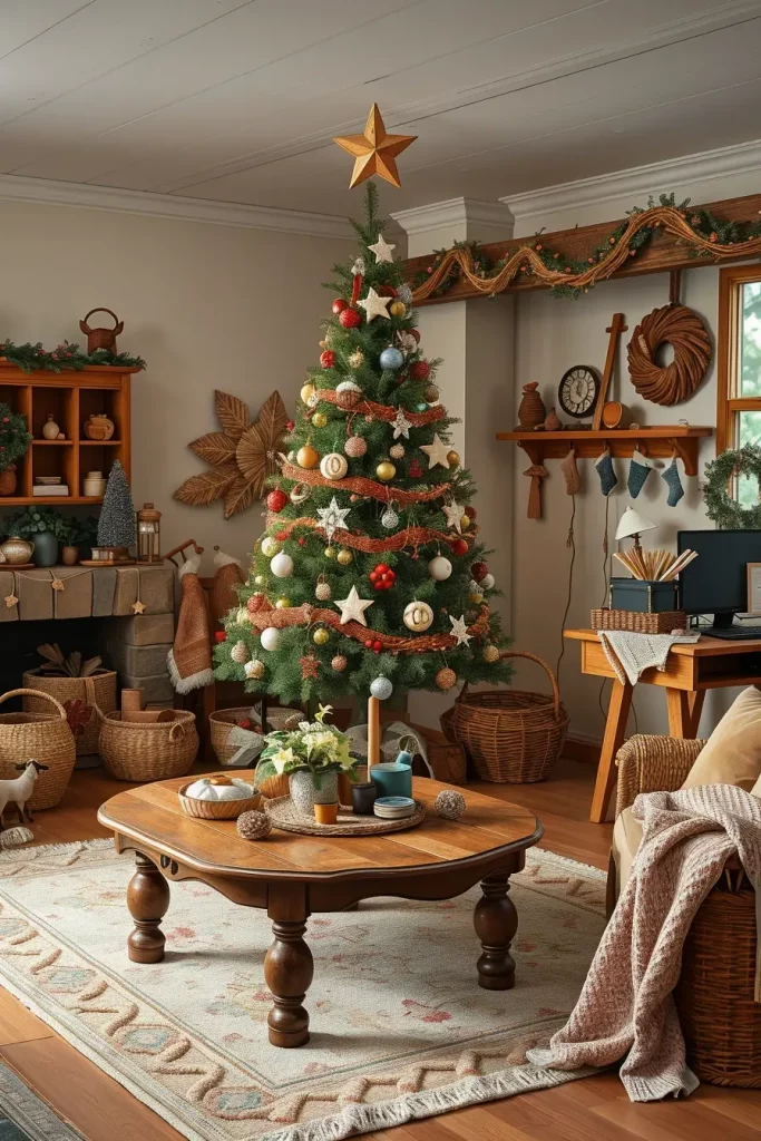 This is a year that odd materials are finding their way in Christmas tree decorations ideas 2025. I have been at interiors with trees that are decorated with ornaments of wood, ceramic, and even green fabrics. These materials are stylish and sustainable in a contemporary living room that has white walls, little furniture and wooden decorations.