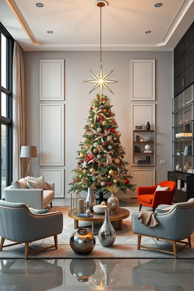 I prefer topping in the form of abstract stars, metallic balls or even glowing geometric shapes. These are complemented by contemporary furniture like smooth sofas, glass shelving, and overstated patterns of accent chairs. The rug on the tree base is a neutral one, so that the topper is the primary emphasis.