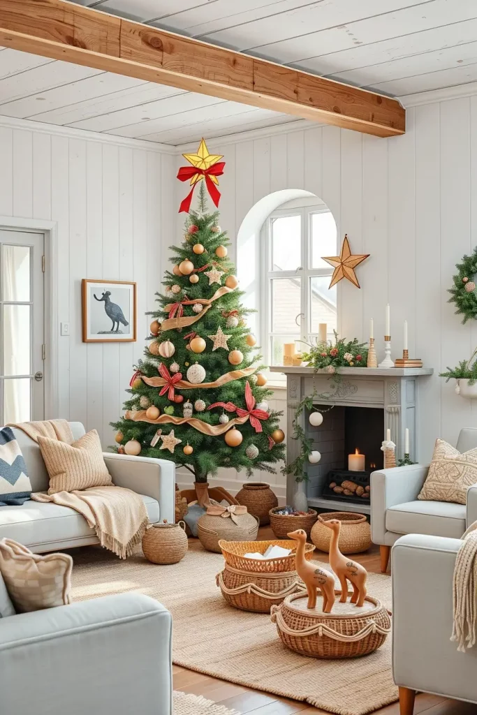 I would like to add Scandinavian-inspired sofa, low profile wooden coffee table, and layered wool rugs in such spaces. These details emphasize the beauty of the natural objects of the strange ornaments. A tree topped using clay baubles, pieces of cloth and paper stars is special but eternal.