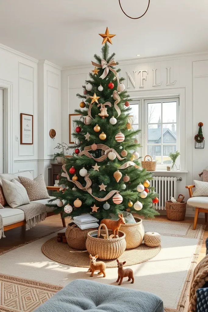 The Christmas trees of Scandinavian influence are ideal in 2025 where austerity and practicality are combined with beauty. I am a big fan of the combination of natural material, dull colors and straight lines and this is where this style fits in perfectly. It best fits in bright and airy living rooms with white walls and flooring, with minimalist furniture. Christmas tree is made the centre of the space and it does not overpower the space.