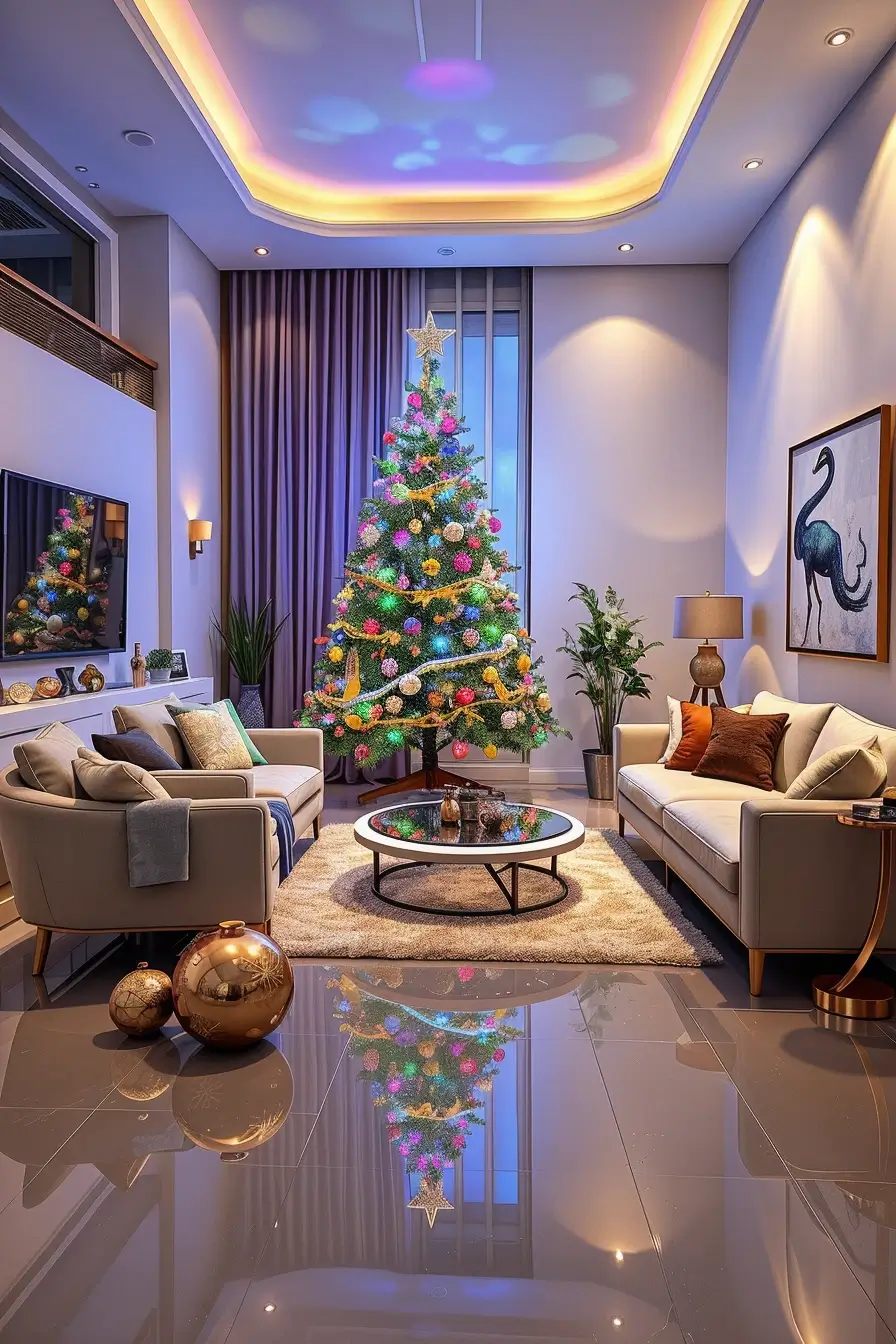 To create a really brave appearance in 2025, I would resort to jewel-colored lights in Christmas trees. Elegant colors such as emerald, sapphire and ruby establish a royal theme. To keep up with it, I would pick deep velvet furniture – a deep emerald sofa or deep sapphire accent chairs that would be styled to fit into the color scheme of the lighting. Another feature that is very well suited in this high-end installation is a marble coffee table with gold embellishments.