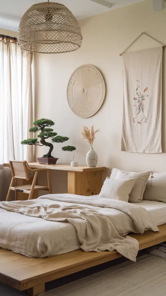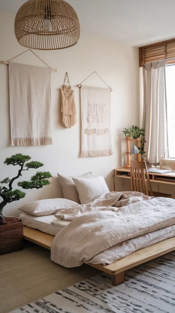 The essential things that come to my mind to get a Japandi style are a low-profile wooden bed frame, the linen beige or sage bedding, bamboo study lamp, and whitewashed pine desk. Storage is hidden and purposeful – such as woven baskets below the bed as well as drawers that glide softly. The minimalist decoration is a bonsai plant, a ceramic tea mug, or a minimalist piece of fabric hanging: any of those will make the space unique.