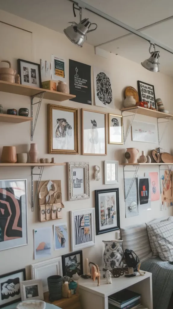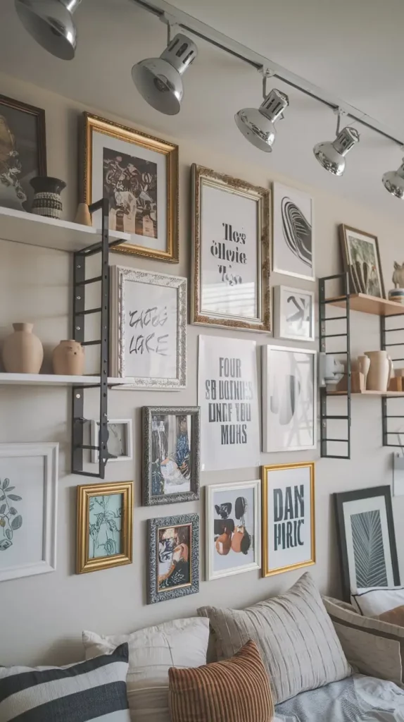 Begin with using a whole wall or corner area to put this display. I suggest a mix of frames in varying sizes (matte black, wood, or acrylic), filled with prints from online creators, personal photography, or handmade collages. Add a decoration to the appearance with string lights or spotlight clip-lights.