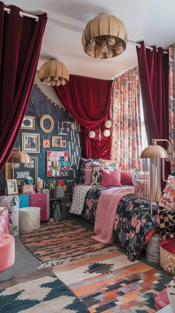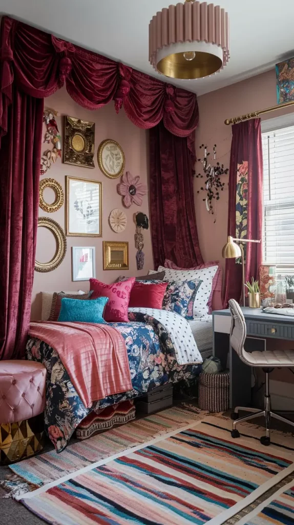 Start with a neutral background of soft furniture and add jewel tones of throw pillows, floral-patterned bedding, funny wall art, velvet curtains, and rugs on top of each other. Bring in fixtures of personality by using mismatched vintage frames, decorative trays and garlands of tassels. The trick is that everything must be intentional here, nothing must feel extraneous since it should be chosen and expressive.