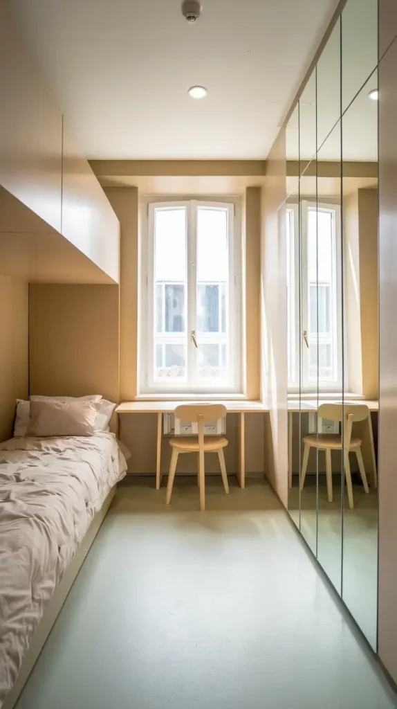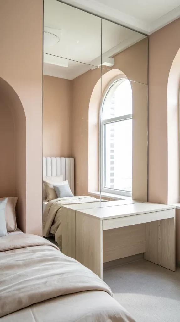 Or, rather, in a small dorm room space should not only be used wisely, but also maximized visually. I have always advised the use of mirror panels because of their interesting visual effect as well as use. They reflect light and make the room look larger and they enhance the design without making it look congested. In 2025, the oversized, vertical mirrors, or mirror-tiled wall pieces are a thing, especially behind, the desk or on a narrow wall.