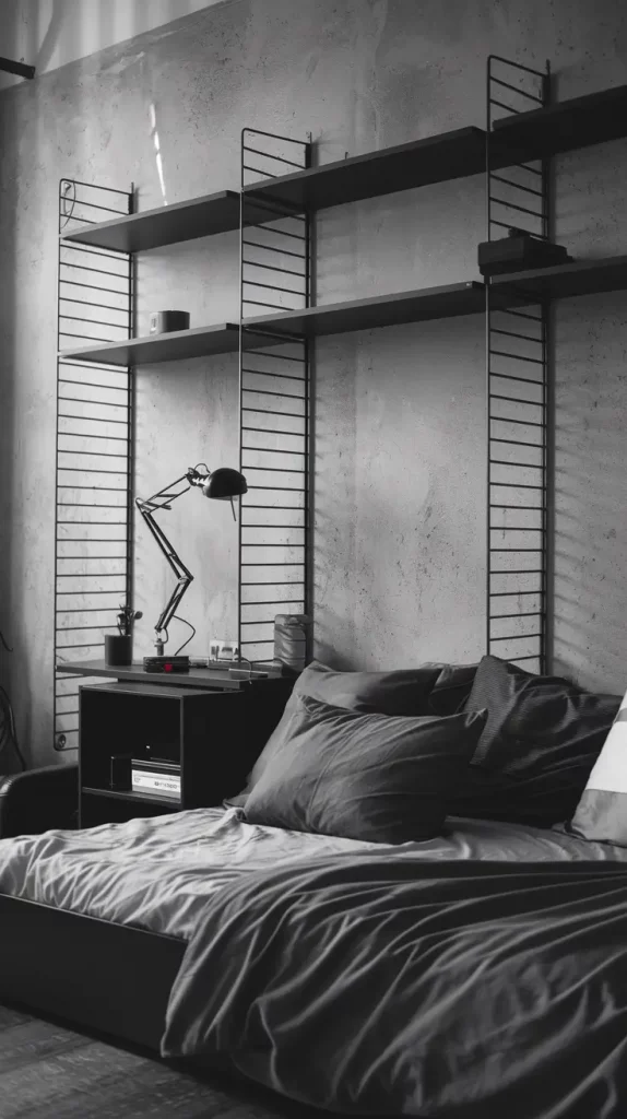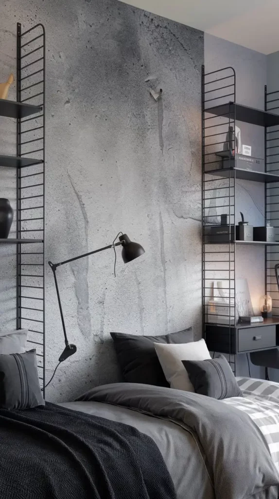 Use three major tones: off-white, mid-gray and charcoal. Your bedding, curtains and your rugs can match this color scheme. Match them with matte black lamp bases or metal bookends to have a stronger feeling of modern theme. Wall decals made of concrete-texture and simple desk chairs are also in complement to each other.