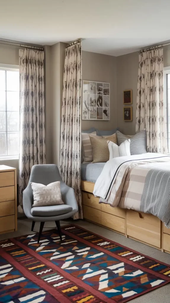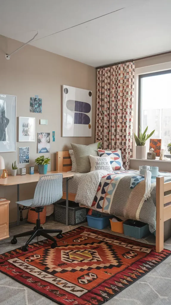 A check out rug can be the spirit of a dorm. I’ve used rugs to anchor a room’s theme, inject personality, and protect the original flooring all at once. In 2025, we’re seeing graphic patterns, vintage-wash prints, and even shaped rugs (like ovals and clouds) take center stage.