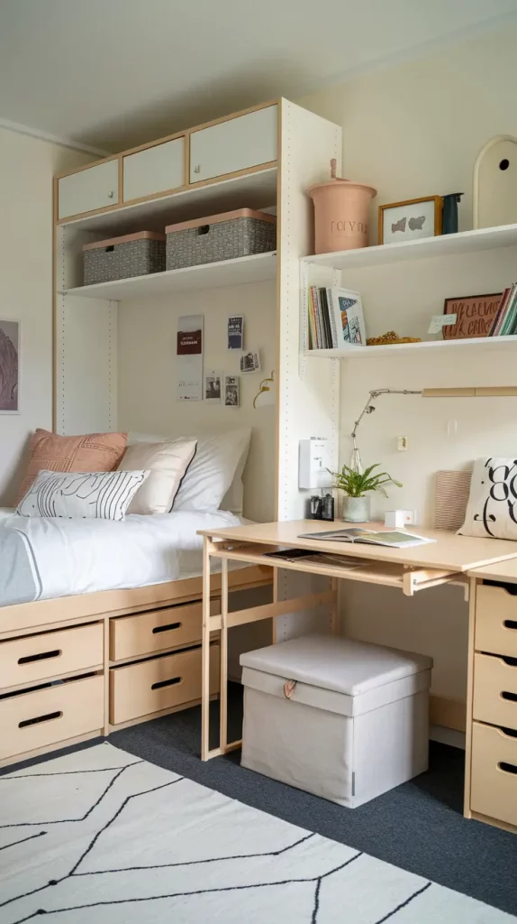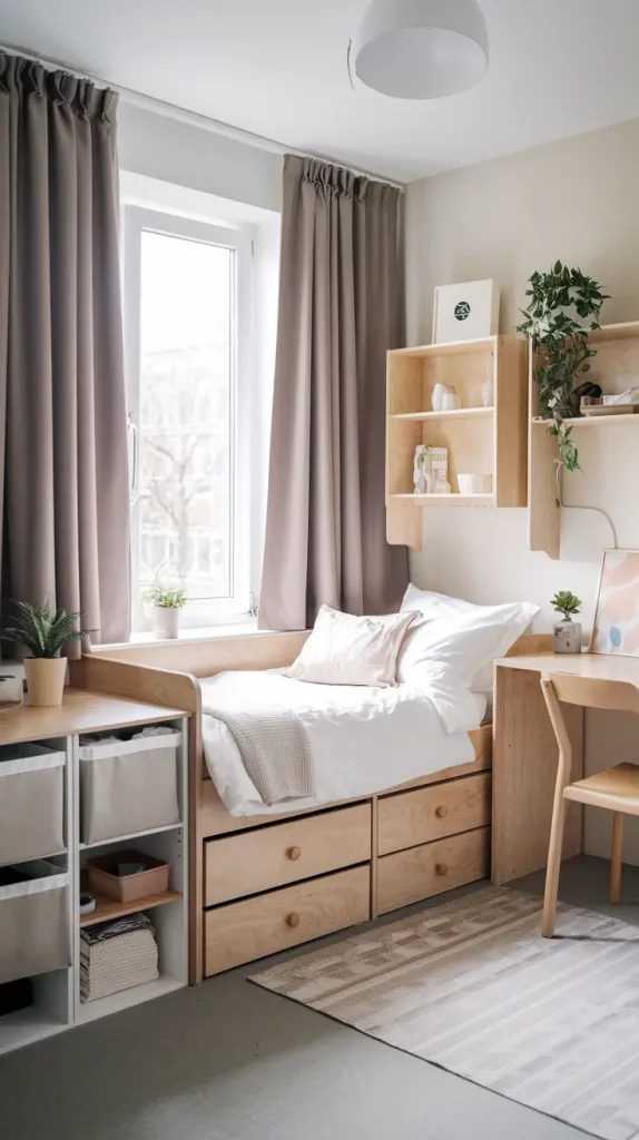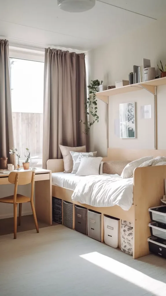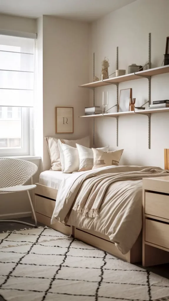 I am a strong advocate of simplicity, and talking about the freshest trends in the dorm rooms interior design in 2025, the Scandinavian interior is one that does not go unnoticed. This design is perfect in small dorm living where practicality needs to find balance with a peaceful visual aesthetic. Imagine light woods, neutral soft colors, and visual clutter-free interiors, developed to help foster peace and productivity.