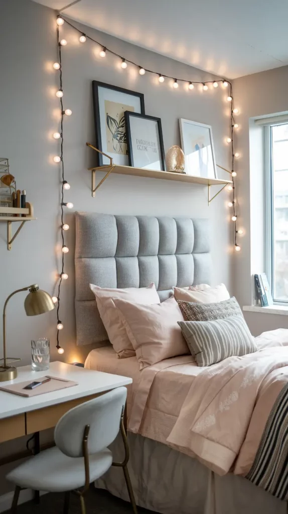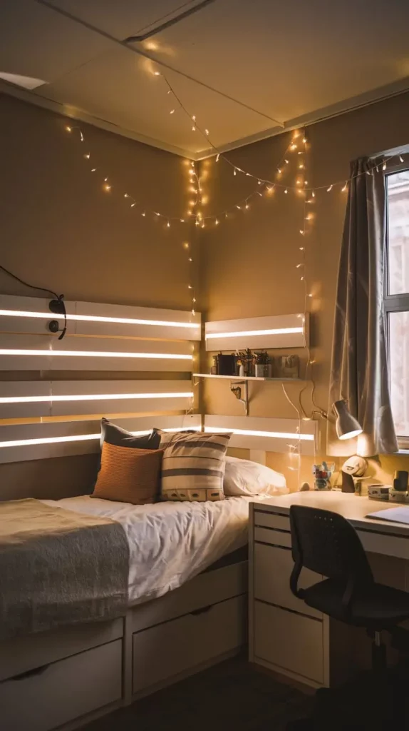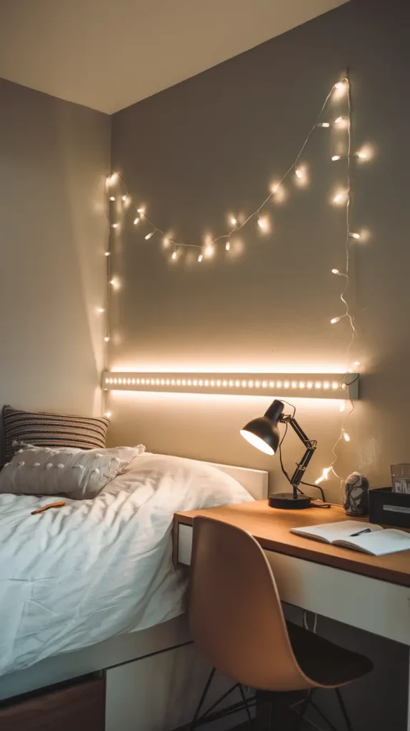 Out of the box, dorm lighting can be awful. I would always make the suggestion of layered lighting against the hard overhead fluorescents. In 2025, we’re leaning into string lights, clamp lamps, LED strips, and battery-powered sconces to create a personalized, aesthetic glow.
