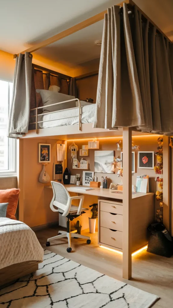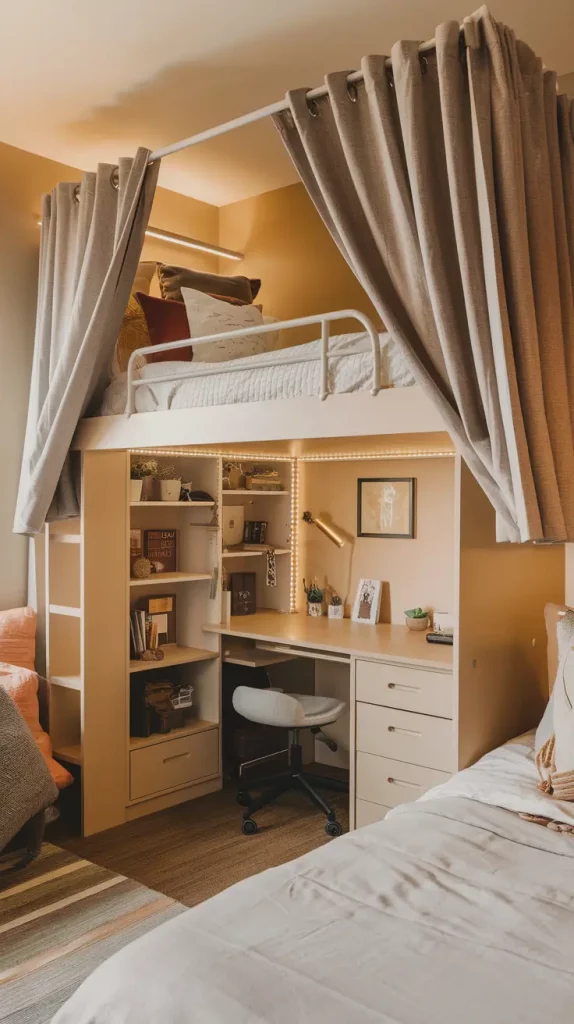 This arrangement is like a complete game changer as per my experience in the design of my dorm. Lofted beds were in the founder of Real Simple list of best space-saving dorm hacks and I could not disagree with it. The curtain is not only functional, it rounds off the metal or the wood frame visually.