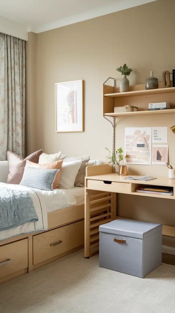 In case of furniture, my starting point is a light wooden bed frame to complement beige bedding. The tone is kept in check with a minimalist desk of pale birch or maple finish, a white mesh chair and area rug of cream color. Soft oak wall shelves are floating and serve as storage, without occupying the floor. Introduce natural components such as a hand-loom basket of laundry or a knitted throw in sandy colours. Lighting ought to be warm, i.e. soft street lamps, soft desk lamps, and strands of lighting.