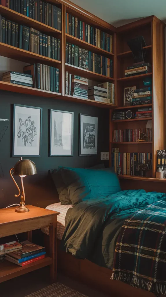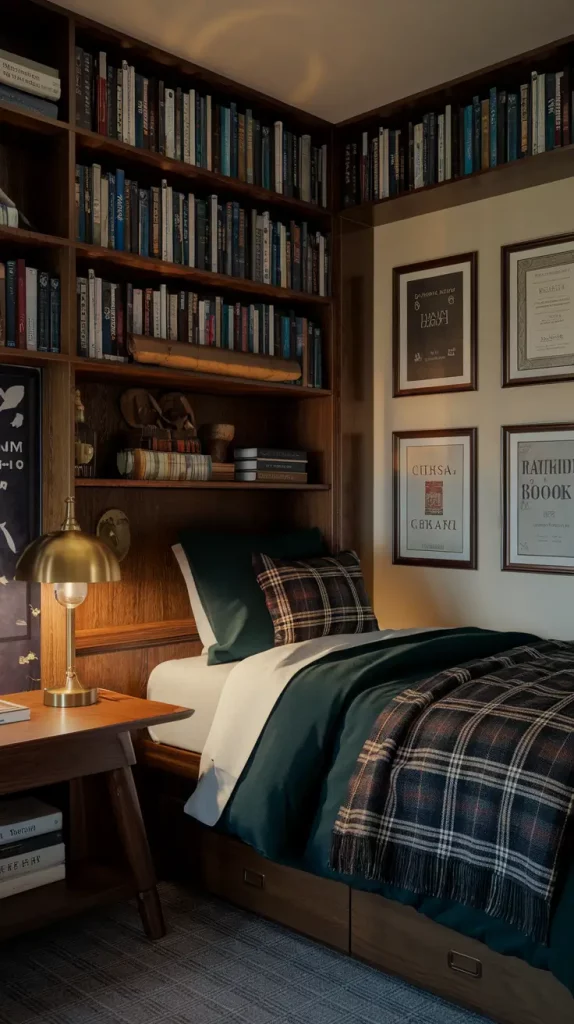Begin with a low-pitched duvet say, navy, burgundy, and then add on some plaid covers. Put in it a little wooden bookshelf, classic literature images frame and brass desk decorations. Amber lights or a faked candle lamp, to give it that touch of an old world.
