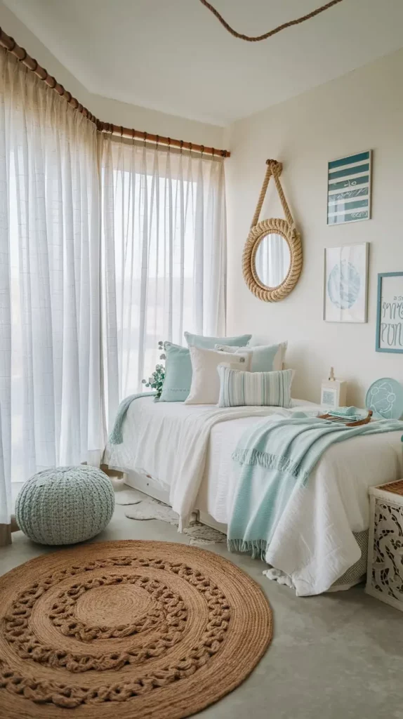 Begin with white bedding and add in cushions in ocean tones. Find natural materials such as jute rugs, light wood furniture and light curtains. A wall print of the sea or beaches, perhaps even a rope mirror or shell garland are charms.