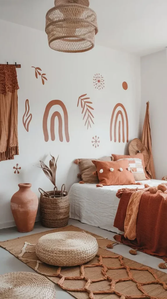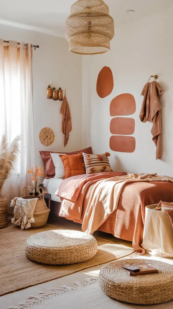 To get this effect, I would suggest a clay colored area rug, burnt orange throw pillows, and maybe a large terra cotta pot with a faux or real plant in it should it be permitted. Add the scheme with linen beddings of warm intention and a soft bedspread in beige or sand color. In case the walls are white, adhesive tiles, having a color of clay, or a wall tapestry of this color range will neutralize the space. The trick is layering, the raw cotton, jute, and woven baskets are some examples of the textures that complement these colors.