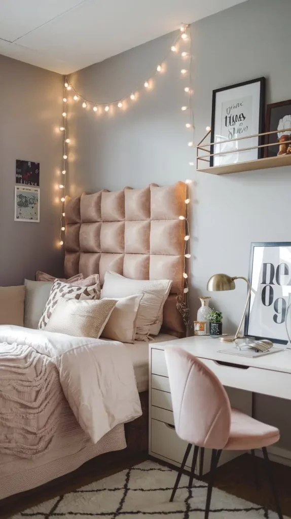 I would get even more plush headboards or pinboards covered with velvet in such spaces. They are under-appreciated, yet place a serious premium on dorm luxury, yet need not take much room.