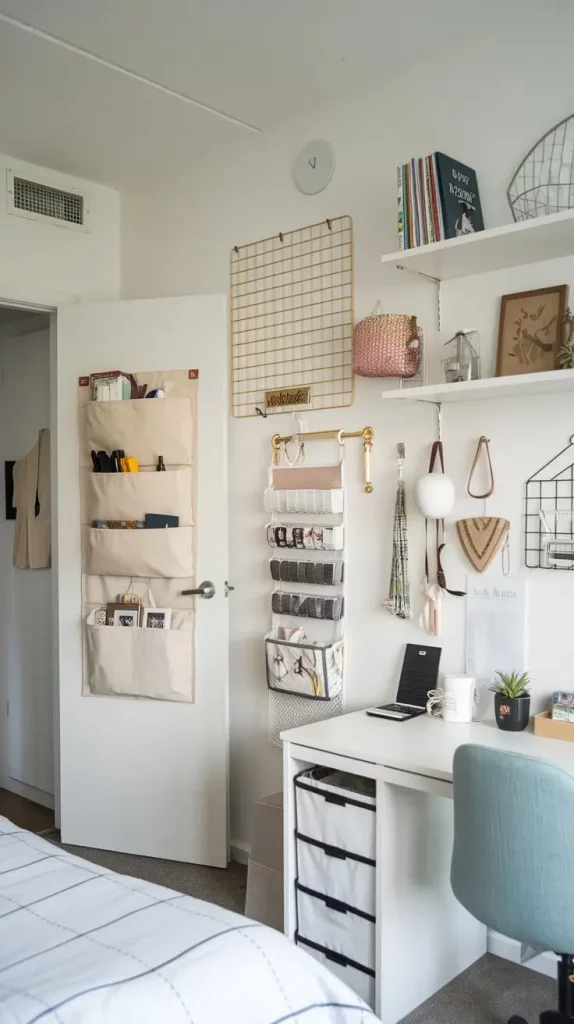The tip that I resort to most of the time would be to have vertical pegboards behind the desk or beside the bed. They can be holding hanging baskets and photos in the frame, headphones, or calendars. Faux leather or canvas over-the-doir shoe organizers are also now available, and hence they are more stylish as compared to the past plastic organizers. Mini desks attached to walls or fold out shelves may be used as side tables or working places as well.