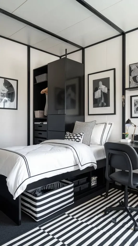 I promise black and white dorm room aesthetic is timeless, modern, and very easy to do, and that is why it ranks top on my list of 2025 trends. The style is clean improvisation, elegant contrast, and visual symmetry, which suits very well to students who want the minimum of distractions, and the maximum effect.