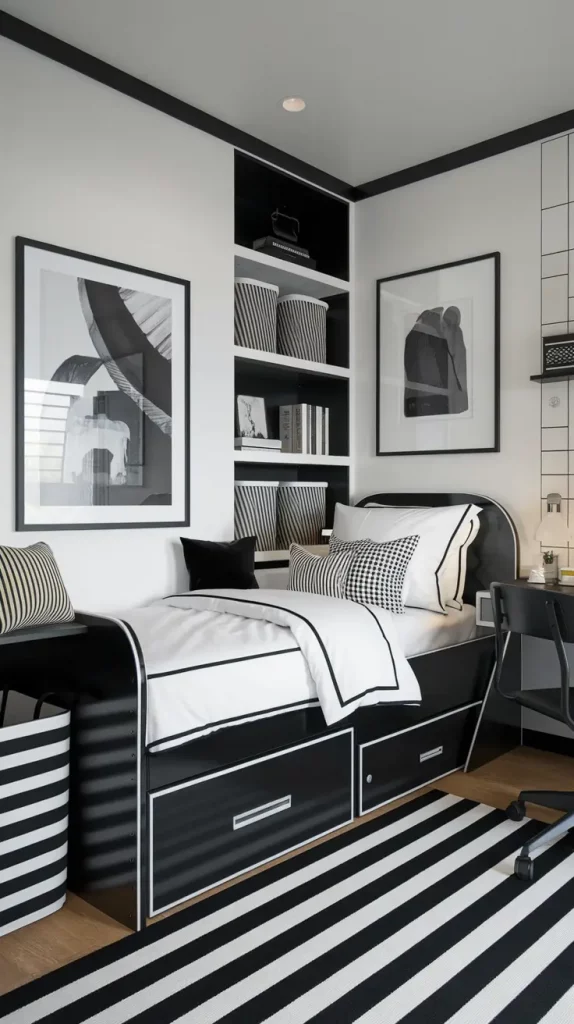 Balance is the key, I would suggest white beddings with black piping and black side tables and lamps with a matte finish. Include a black desk with white surface above them together with a huge framed mirror that has a sleek black frame. Pattern is used in the form of a houndstooth throw or polka dot cushion. Stripes: Monochrome storage boxes also keep your necessities in order, and support the aesthetic to add depth.