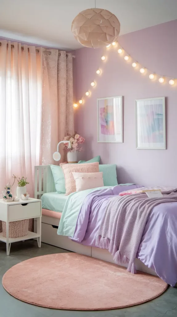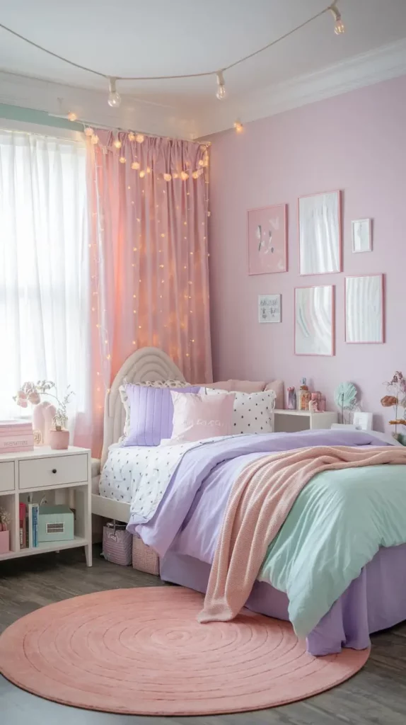 I would take a light lavender comforter, dark green mint cushions, pink curtain and a light pink peach shag carpet. The best is the white furniture, such as a shiny white desk, drawers of the same color, and mirrors in a shape of clouds. The warm-colored string lights produce the effect of a dreamy atmosphere. Include soft-coloured ceramic vases and art prints with pastel frames to make the place seem more unified.