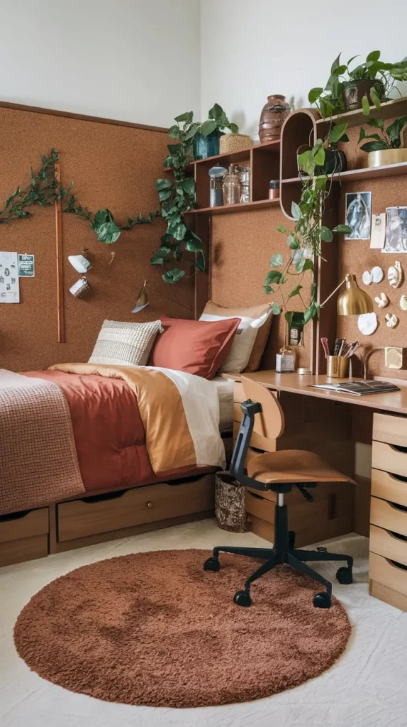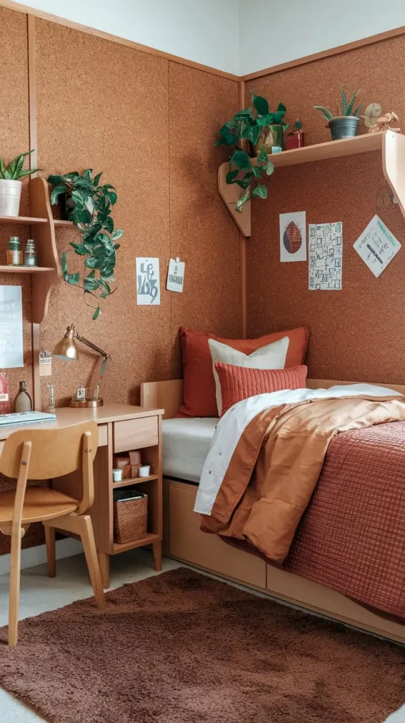 Terracotta and clay colors have turned out to give a surprisingly homey and rooted experience in a dorm room. These naturalistic colors of natural materials immediately bring warmth into purely sterile environments. In 2025, a greater number of students are gravitating to this palette to replace the minimalism trends present in the past as a comforting option. It also suits feminine and also the neutral interiors in which the clay inspired design element absorbs all the personality without letting the small room feel cluttered.