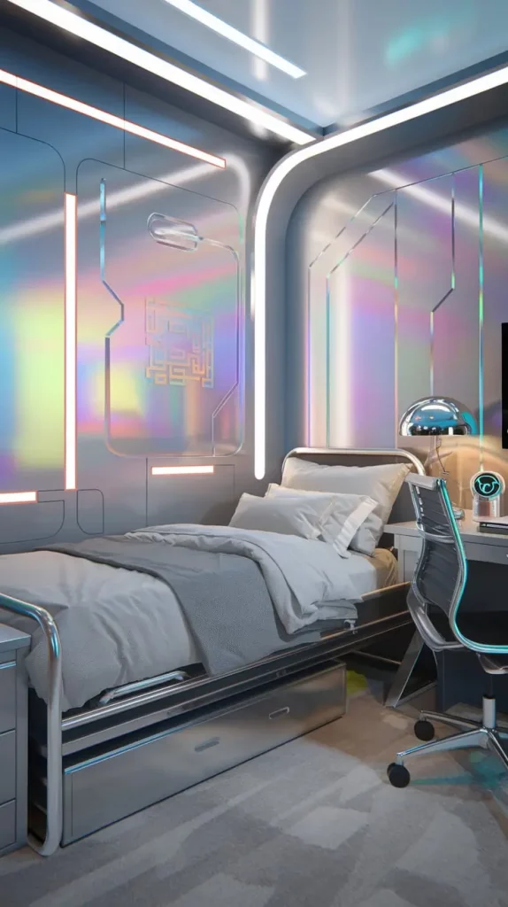 The Dorm Rooms of 2025 are bringing ultra-modern elements of design in fantastic shapes, forms and finishes: and metallics are taking center stage. I would want to recommend this style to the tech lovers or anyone interested in introducing sharpness and innovation to his or her environment. It is hot, contemporary and even scifi-ish.