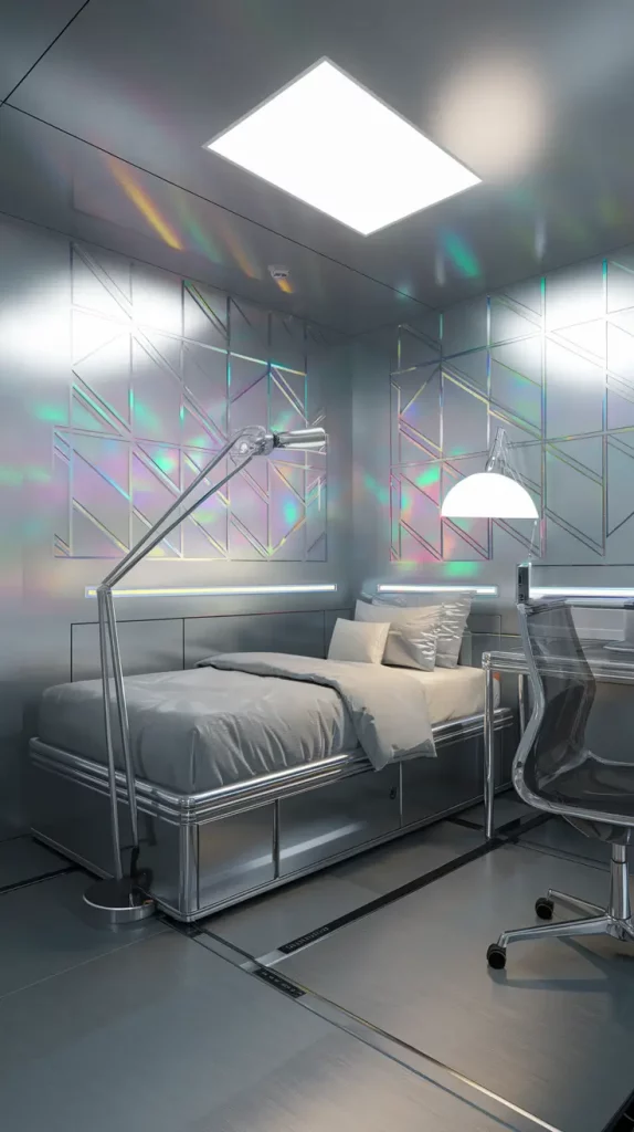 I would propose using silver bed frame, chrome desk lamps, and irresistible wall decorations like wall decal or peel and stick holographic back-splash behind the table. Add furniture with metallic legs (brushed steel or aluminum), and consider a clear acrylic chair with silver hardware. Look is accentuated by bedding of either steel gray or electric blue. Technological nerdiness is also seen in the form of an LED digital clock and silver wall hooks.