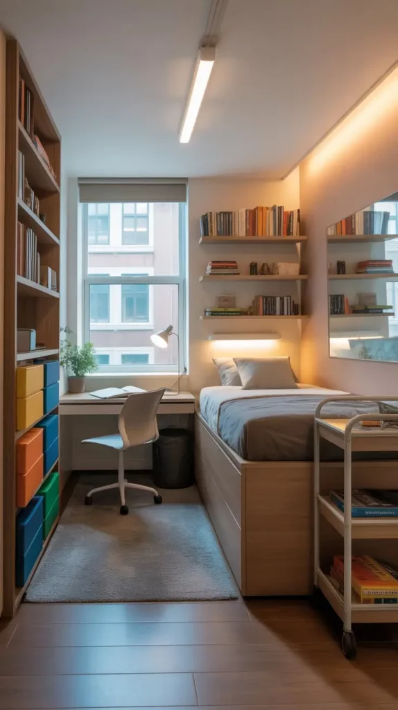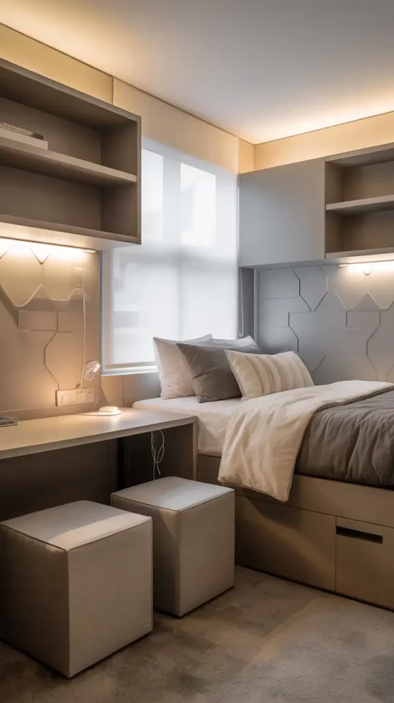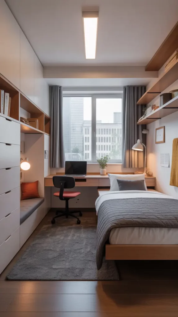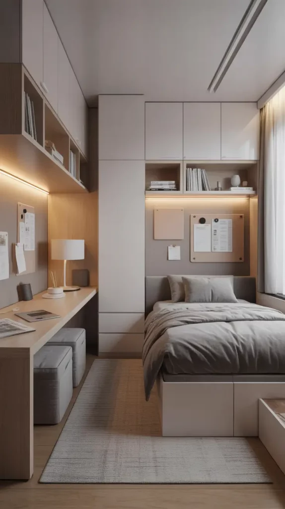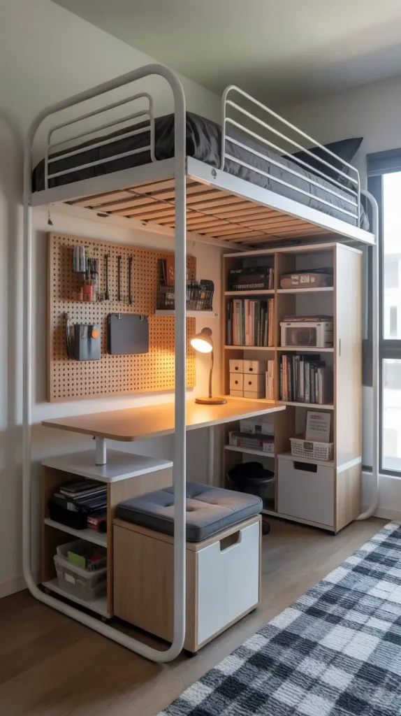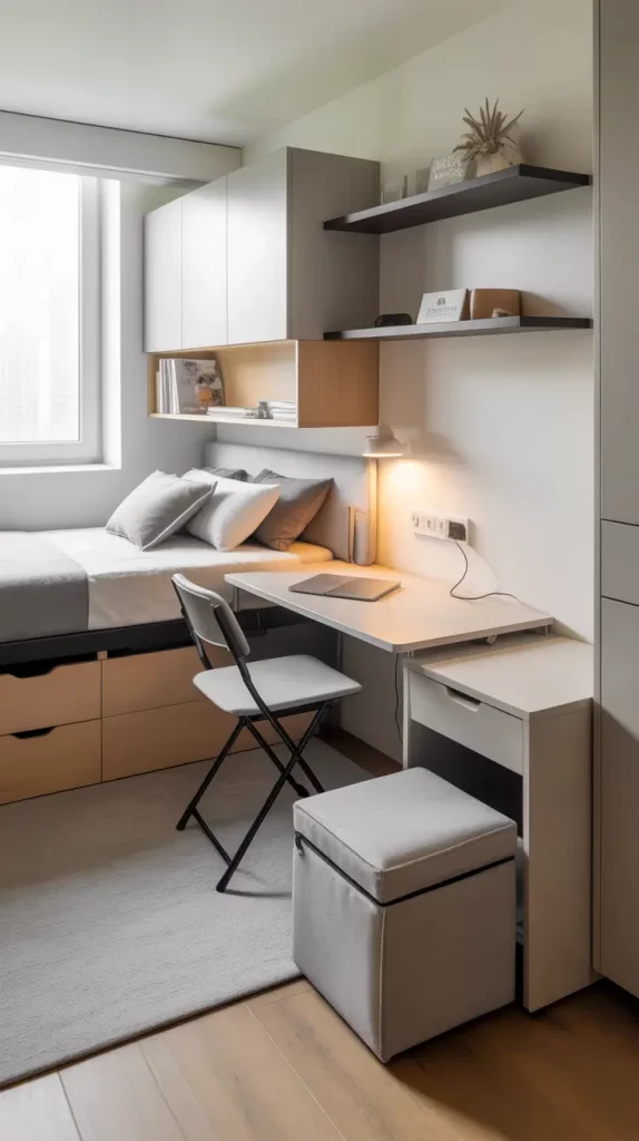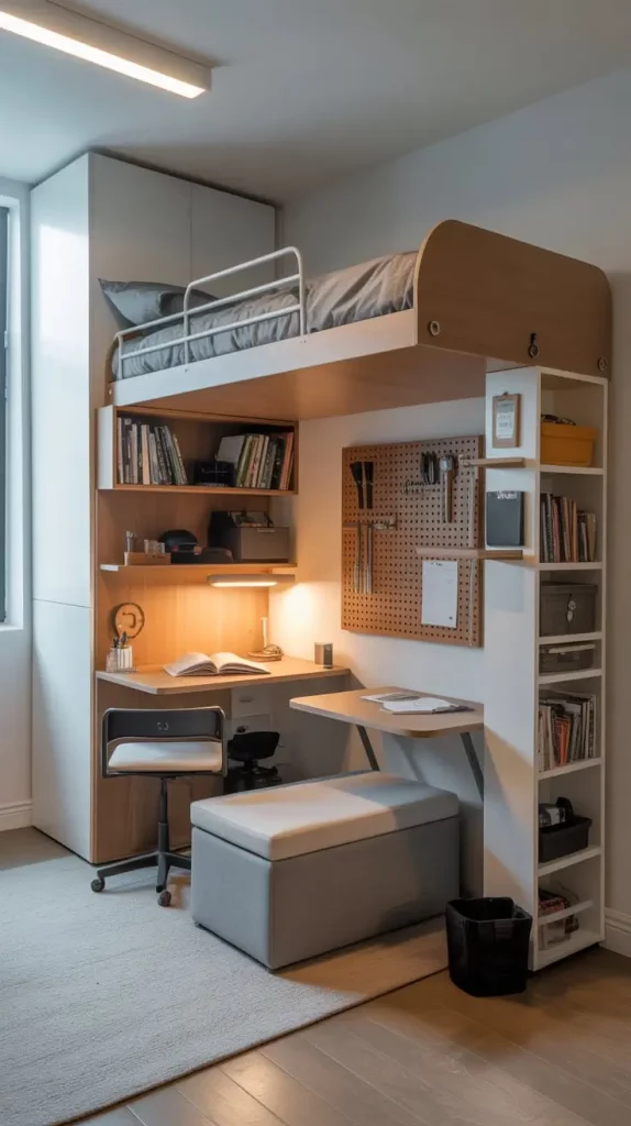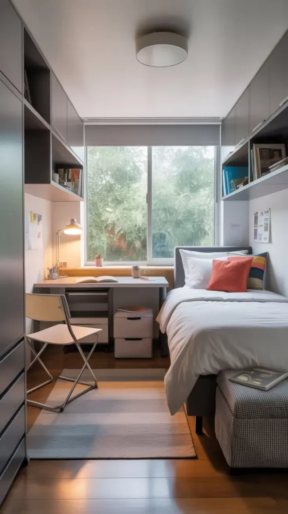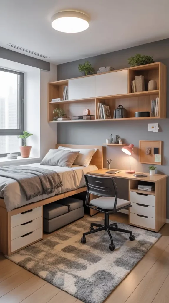 I usually incorporate beds with inbuilt drawers, desks with adjustable shelves, ottomans that are storage space doubles, and foldable tables that could be used to either eat or study. Wall lighting offers desk area and pegboards and cube organizers facilitate the storage of supplies. These considerate additions use as much space as possible vertically and can be accessed.