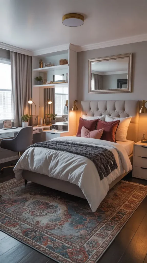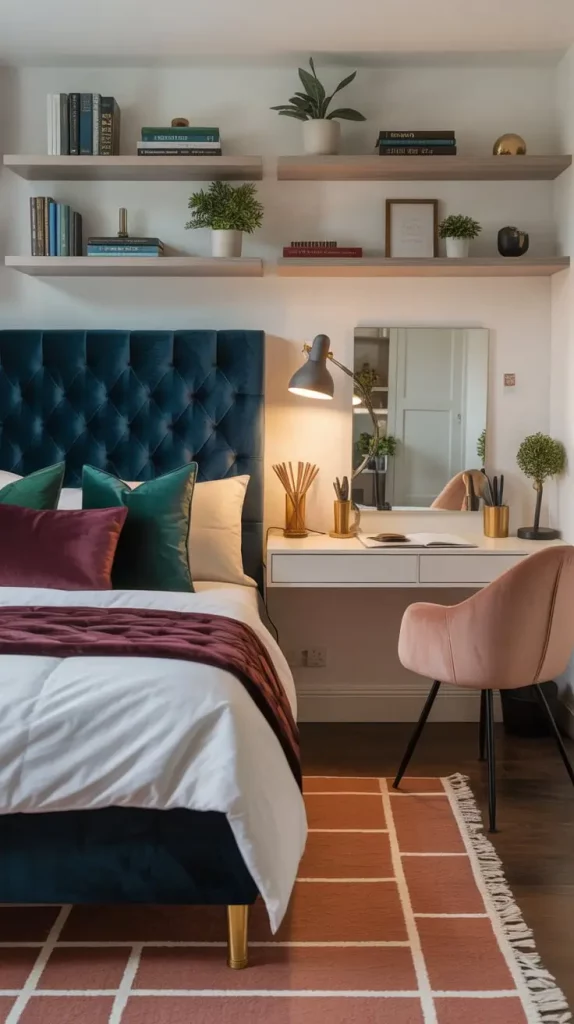To create a glamorous design, I would use accent pillows made of velvet, smooth desks, gold or matte-black lamps, tufted headboards and also decorative shelves. Bedside tables should be matched or desk organizers should be coordinated to bring the design together. There is also the element of boldness which I like to add with the help of an area rug with a cozy pattern or a shaped chair.