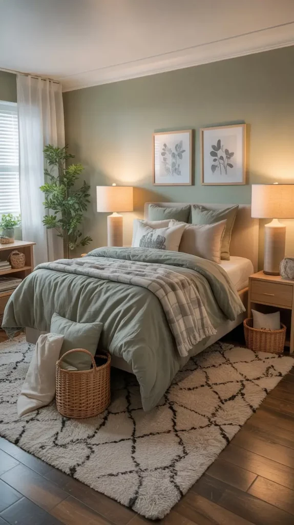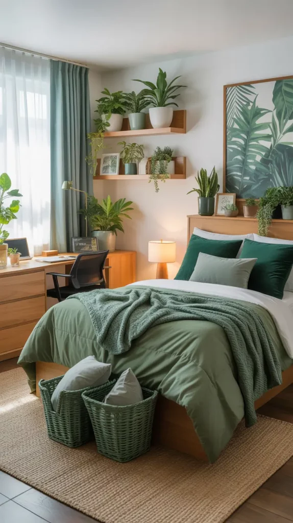 My top choices are green throw pillows, green comforter that is soft, and potted plants or fake greenery since they are easy to maintain. The addition of a botanical print over the bed and the small storage baskets that are green often help align the color scheme. The color green is used in different textures like velvet, cotton, woven materials and it does not overpower the room but it makes it more dynamic.