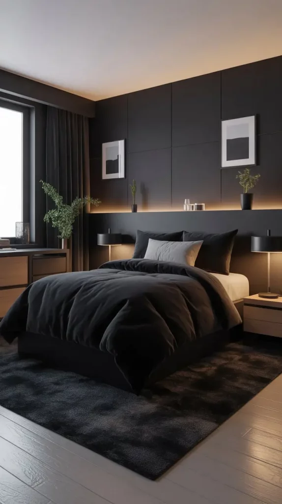 My normal additions are black bedding, lamps of matte-black color, charcoal rugs, and simple shelving. I add some light or white wood to the room by adding bedside table, frames or desk accessories to avoid making the room too dark. Stainless touches such as chrome or brushed gold also coordinate with black and give it a contemporary gloss.