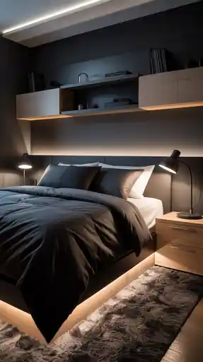 I would include back lighting of the desk or back of the headboard using LED. This is in opposition to the dark decoration and adds to the modern look.