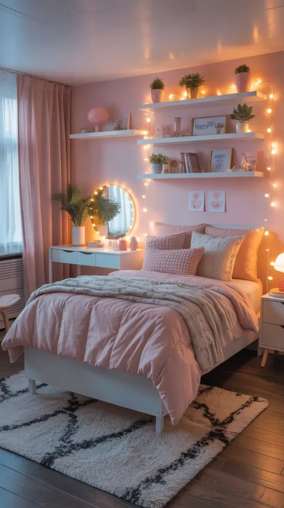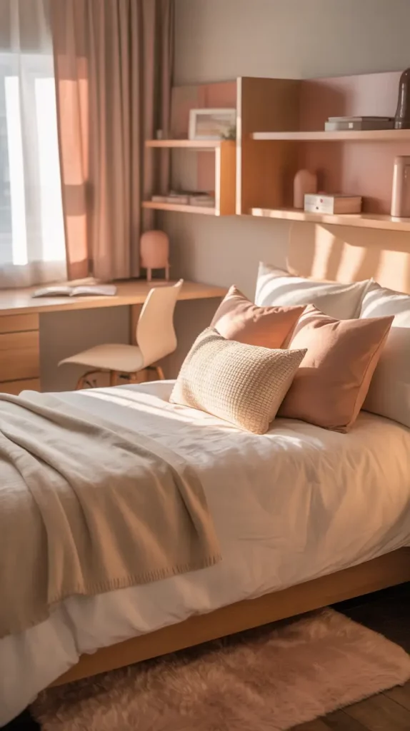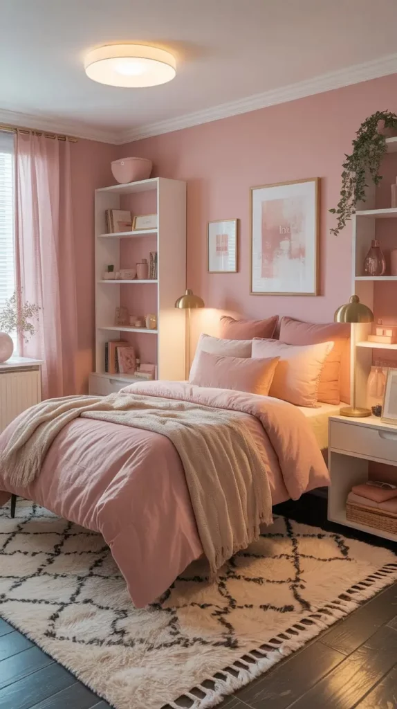 The 2026 pink dorm rooms have a tendency of being soft and muted colored that look sophisticated but not so playful. In designing a pink-themed room, I would work on a palette with a balance between blush colors and whites, creams, and warm metallics. It is particularly effective in a dorm room since it adds femininity and coziness but does not dominate the room.