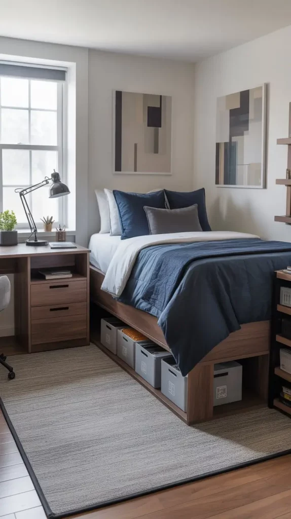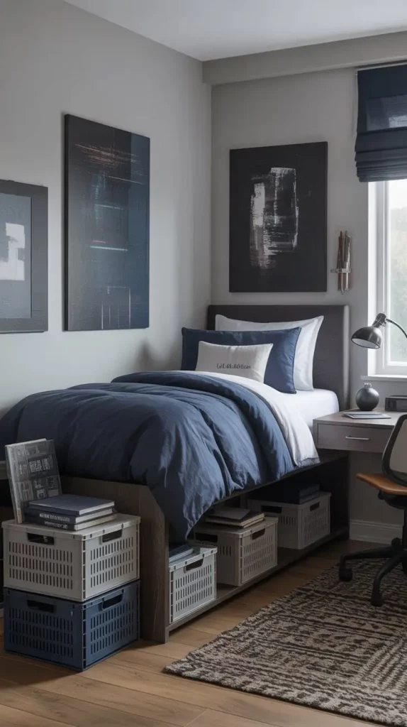In the case of furniture, I would add a durable desk, a comfortable desk chair, charcoal or navy bedding and a rug that is durable. Storage is also an important consideration, and thus under-bed drawers, stackable crates, or quite small shelves are used. Wall art with abstract lines or subdued colors brings character, which does not cause visual distortion. I also prefer to have a modern touch with a black or a metal-frame lamp.